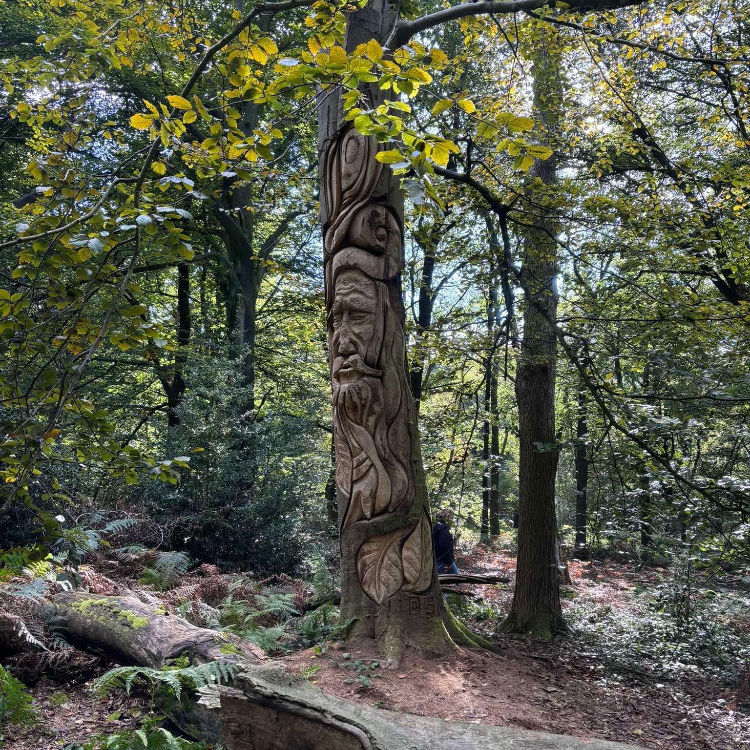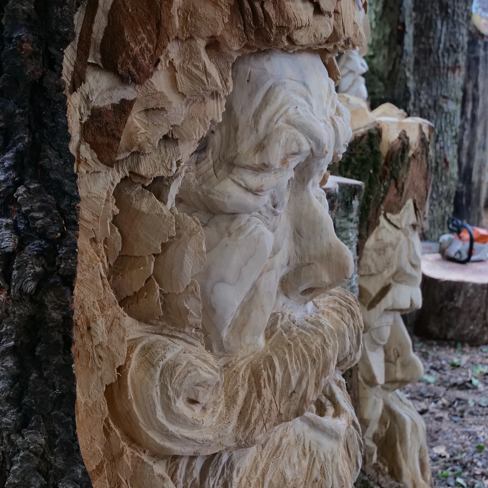 - Des sculptures de Felix Mahieu sous forme de visages taillés dans des troncs ou sous forme d’animaux.